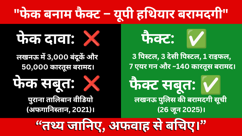 हमारी जांच में सामने आया कि यह वीडियो 4 साल पुराना है और अफगानिस्तान में तालिबान द्वारा कब्ज़ाए गए हथियारों का है। इसका लखनऊ की बरामदगी से कोई संबंध नहीं है।